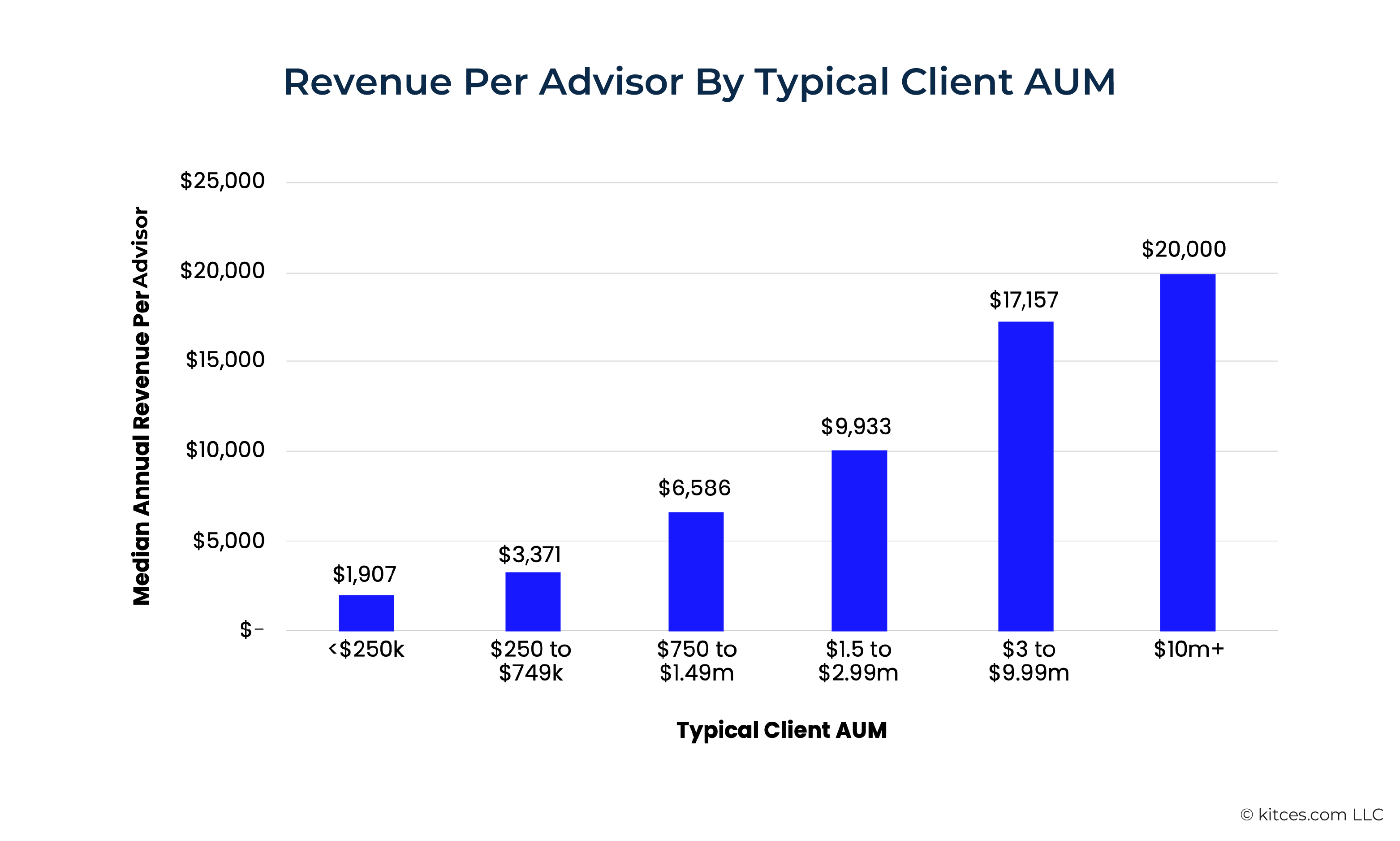 The result is that firms serving more affluent clients are substantially more productive than their peers. Teams primarily serving clients with less than $250,000 in assets generate about $180,000 in annual revenue per advisor, while those serving clients with $5 million or more generate $1,212,500.