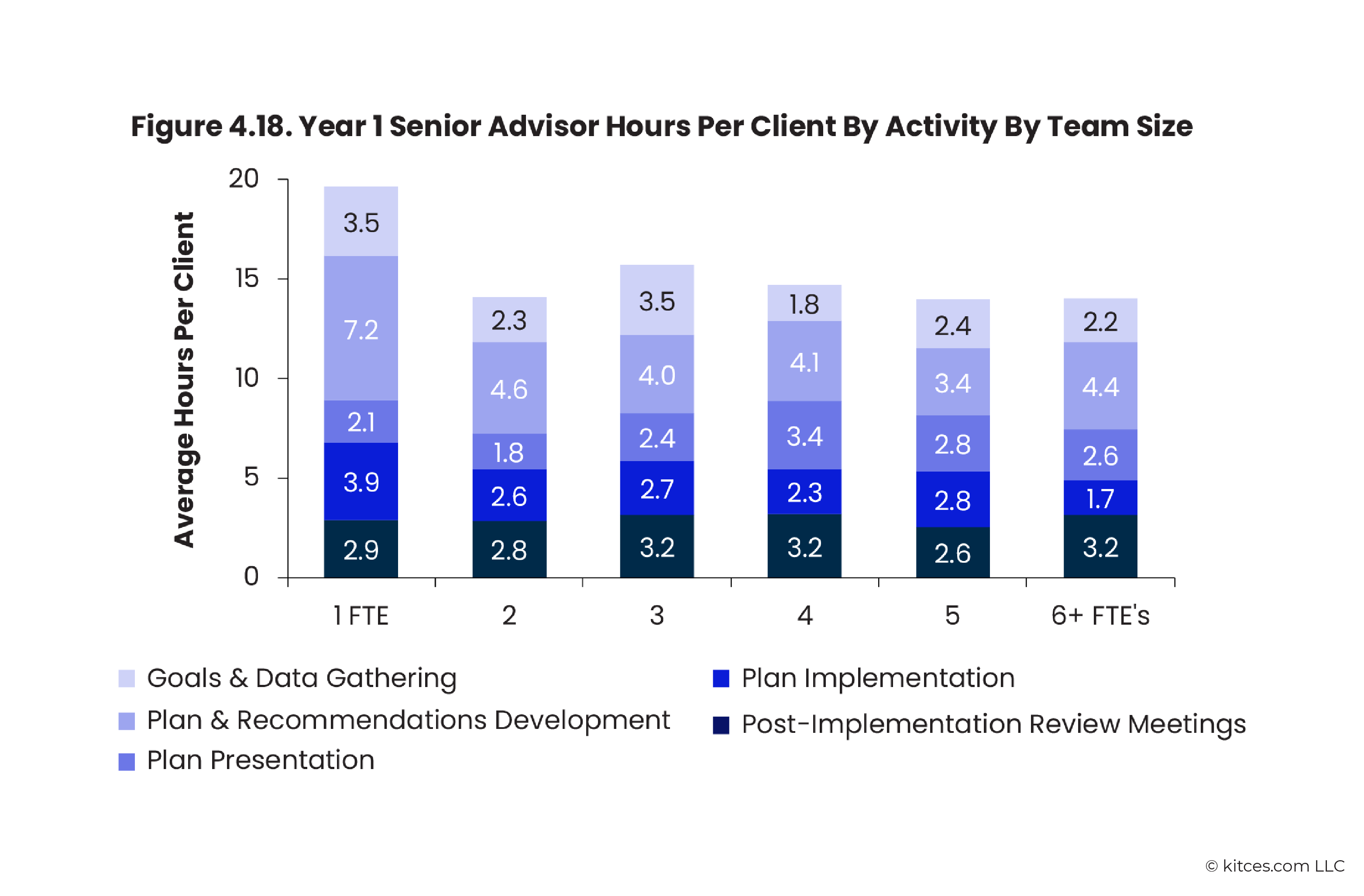 One example of the power of delegation is the change in senior advisor hours per first-year client once they've added more help to their team. By themselves, the senior advisor spends about 20 hours with a client in the first year. With even one additional hire, that time drops by 25% to about 15 hours. And while some categories (such as plan development) decrease more than others, the senior advisor doesn't wholly step away from any responsibility. Instead, they reduce total time by whittling away across multiple areas.