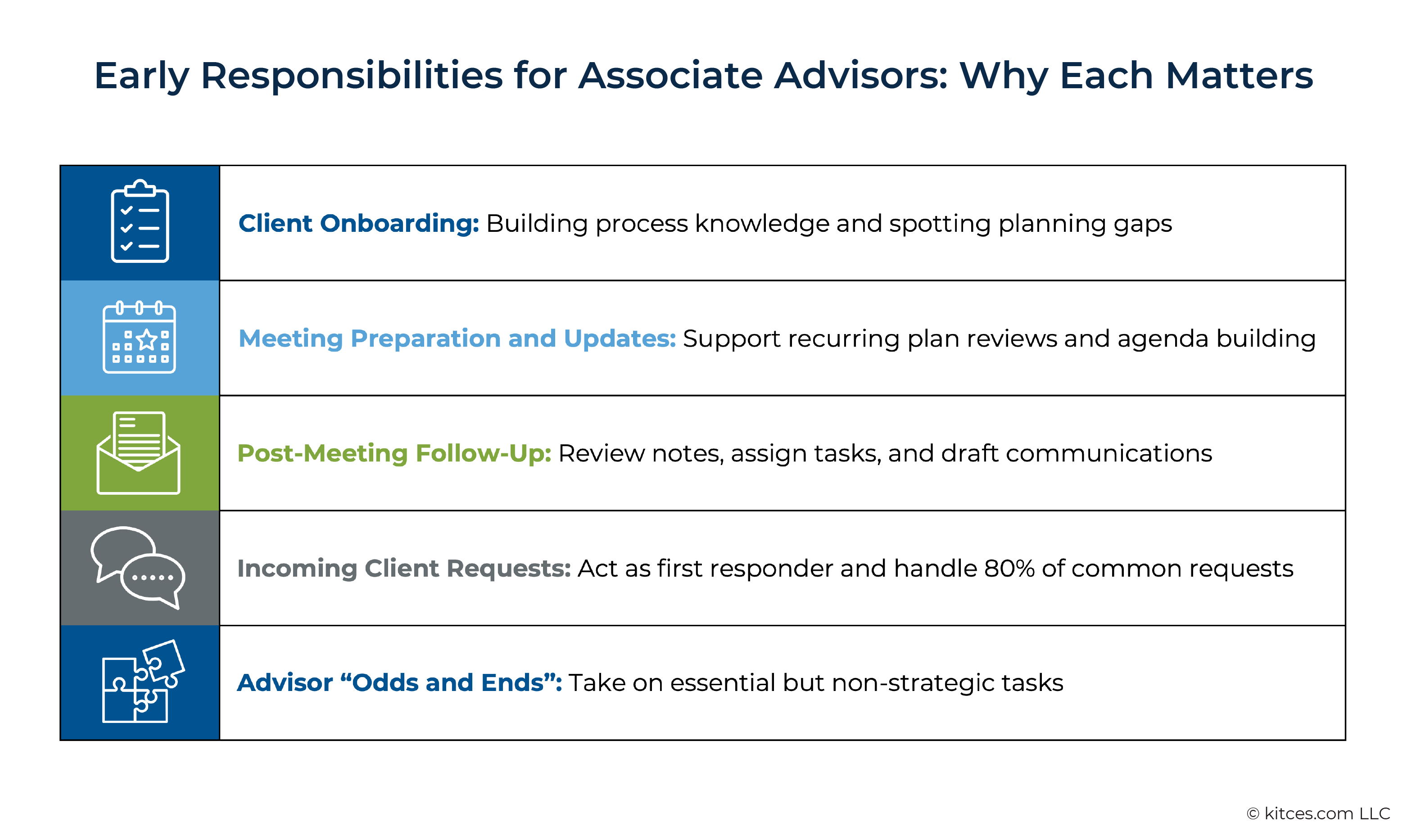Client meeting prep is another early responsibility that offers structured learning opportunities for newer associate advisors. Many advisory firms update components of client plans on an annual or biannual basis, or have scheduled periods to review estate, insurance, or other types of planning needs, barring any immediate urgency.