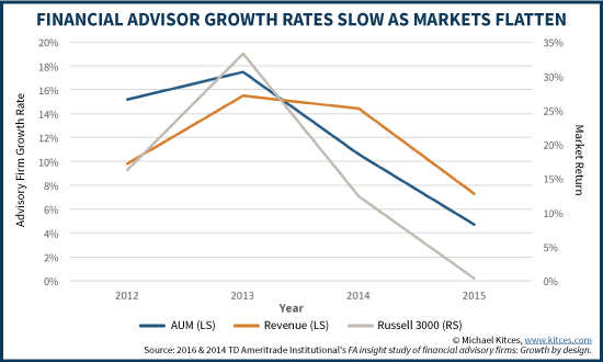 And the latest financial advisor benchmarking study from FA Insight finds that in fact, the growth rates for financial advisory firms did fall substantially in 2015 (though they remained positive), as measured by AUM or revenue. However, this appears to be driven primarily by weak market performance in 2015; the more stable growth rate based on clients fell only slightly in 2015.