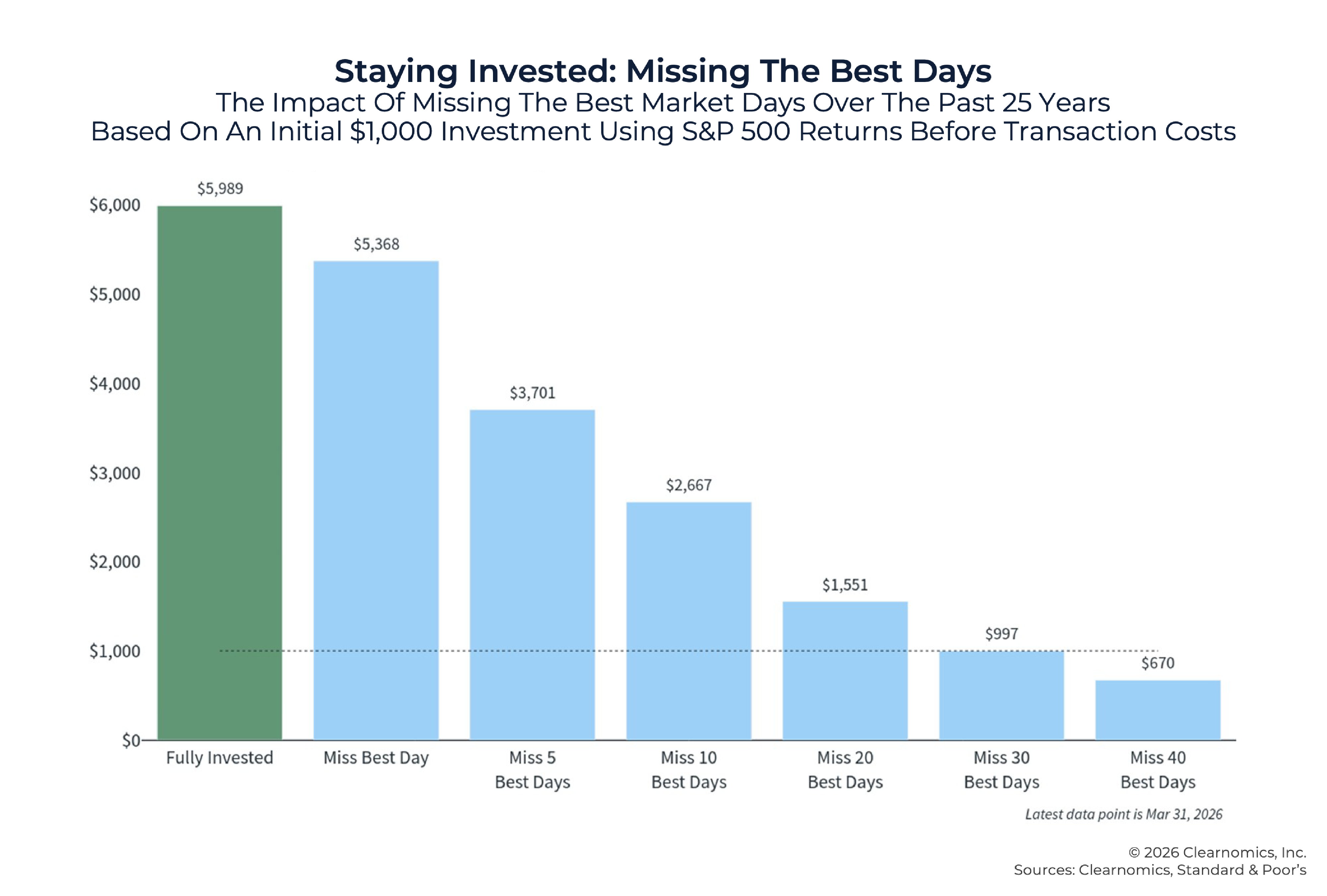 As the accompanying chart illustrates, missing just a handful of the market's best-performing days over a long period can dramatically reduce cumulative returns. An investor who remained fully invested in the S&P 500 over the past 25 years would have fared far better than one who stepped out of the market even briefly during moments of peak uncertainty.