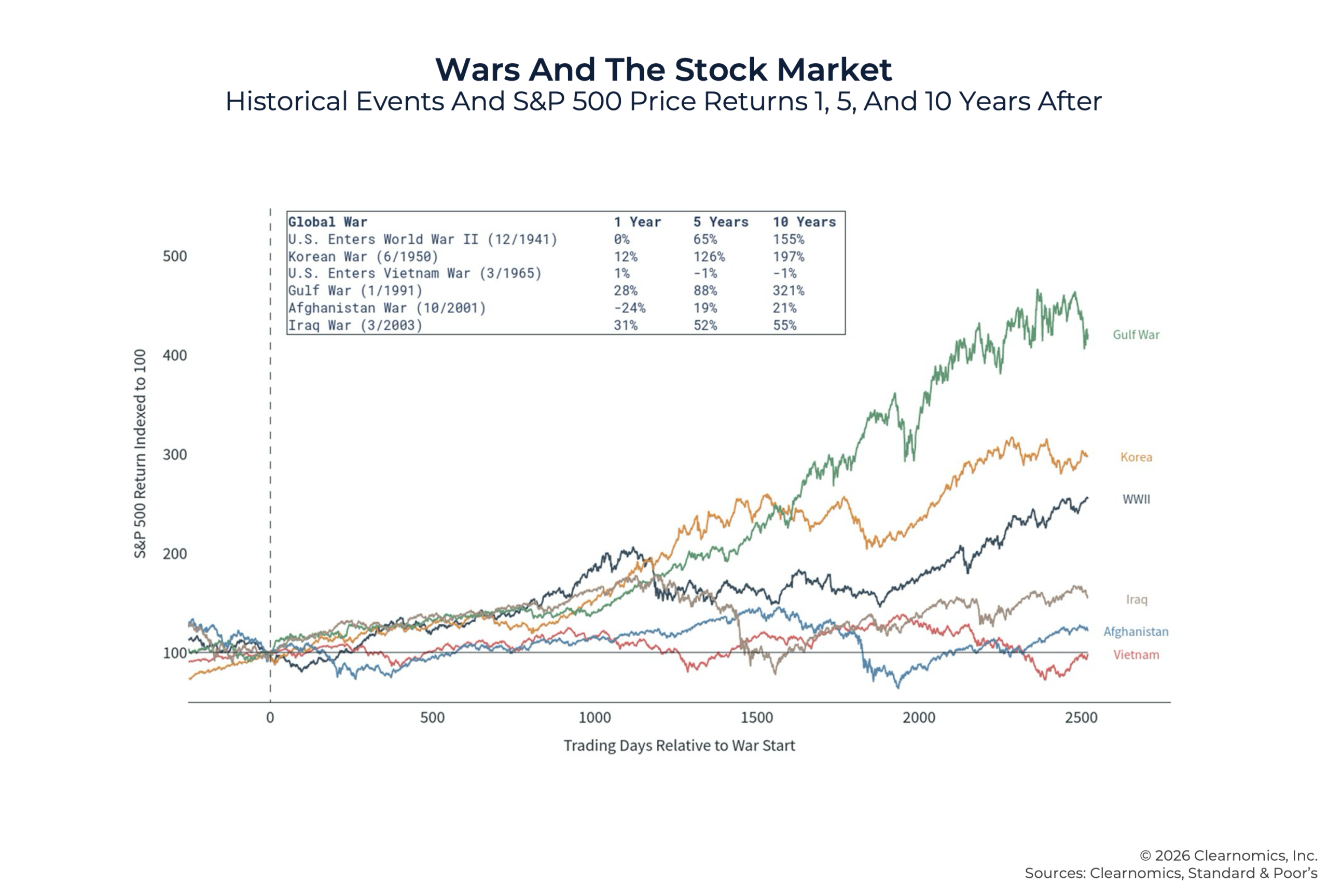 Geopolitical risks of this nature are notoriously difficult to predict. There are many unknowns with binary outcomes, including when the war may end and how severe future strikes may be. Still, history shows that investors who make dramatic portfolio adjustments in response to such events often do so at the wrong moment, missing the post-shock recovery that follows. Even the rapid inflation due to the war in Ukraine in 2022 eventually faded.