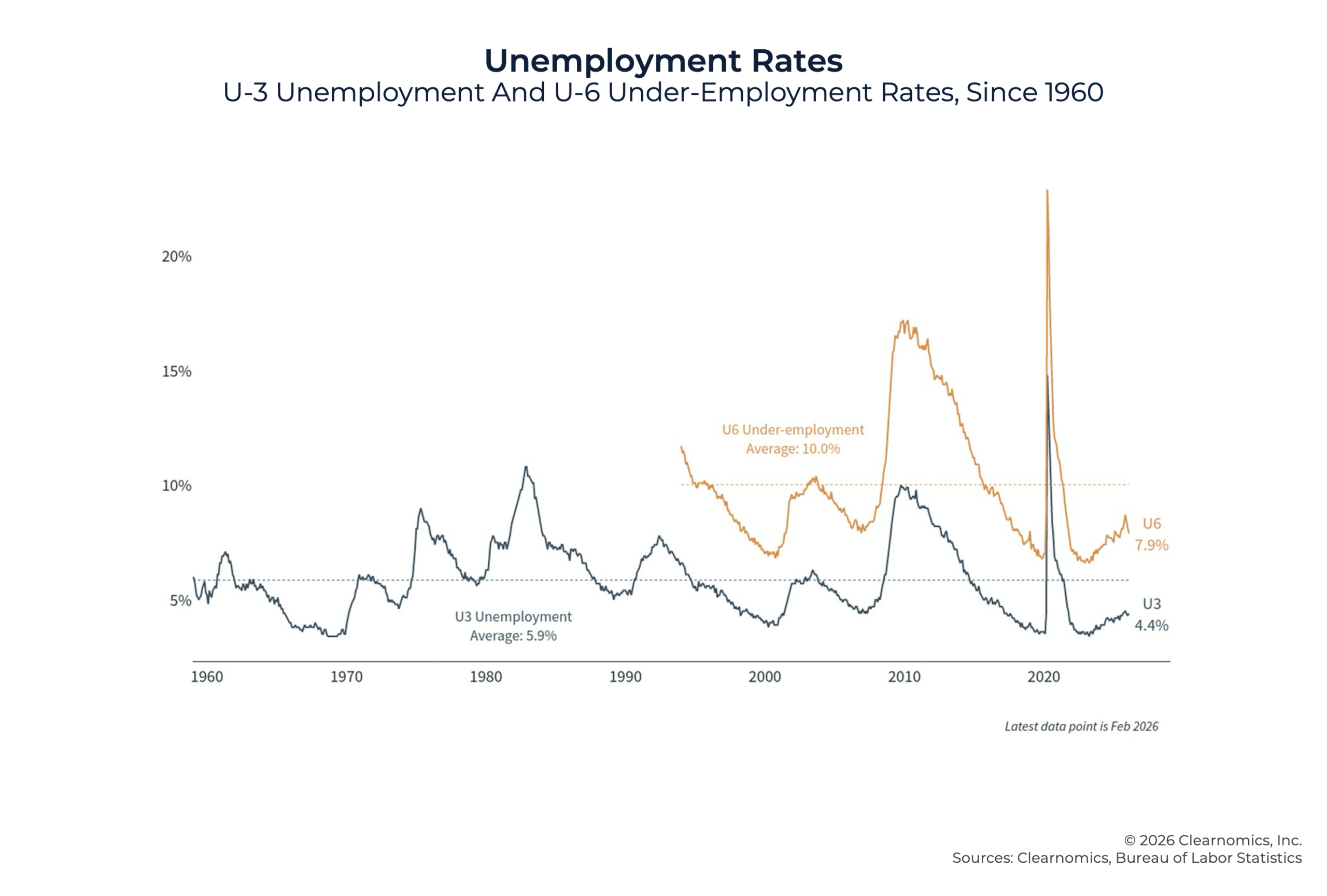 - The unemployment rate has risen modestly to 4.4% as measured by U3, the official rate reported in headlines. The U6 unemployment rate, which includes discouraged workers, has remained low as well. Payroll growth has also struggled, with February 2026 showing a decline of 92,000 jobs. Annual payroll data was also revised downward by 862,000 jobs for 2025, the largest such revision since the 2009 financial crisis. This means the economy added only 181,000 jobs for the full year.