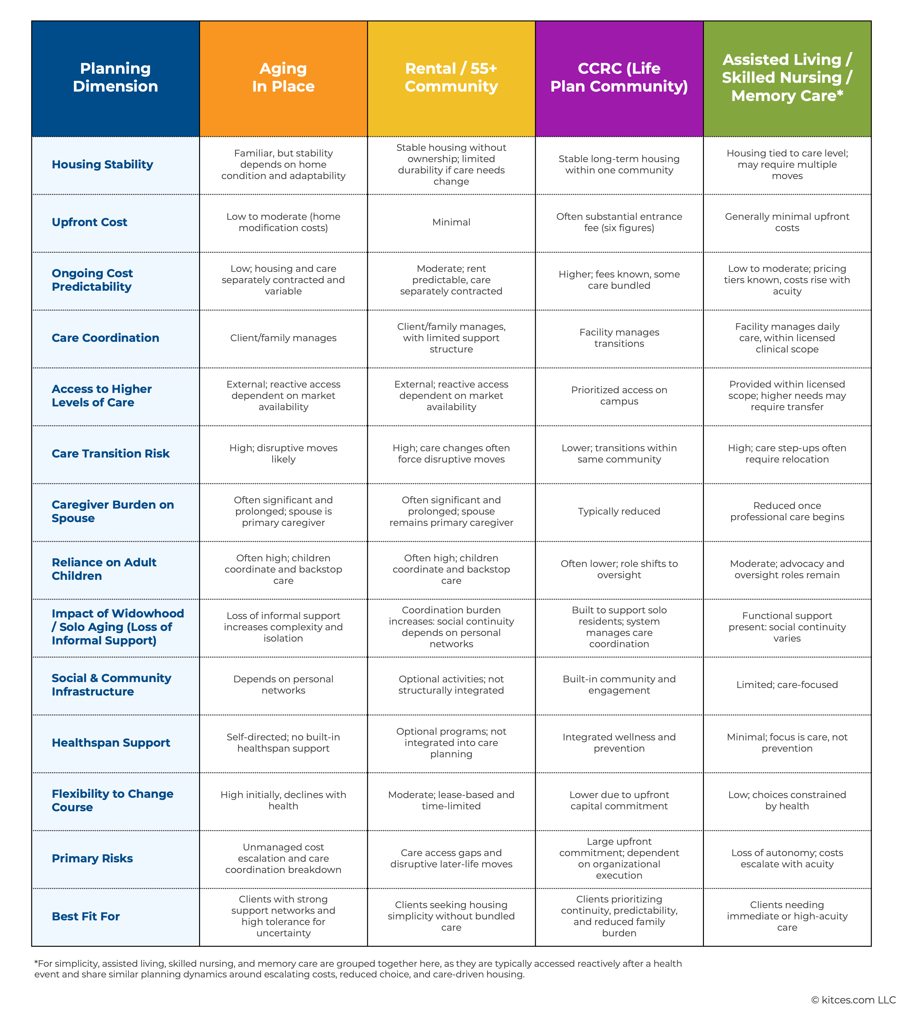 Given the number of later-life housing and care options available, financial advisors can help clients analyze their choices (and the tradeoffs involved) on a variety of factors, both qualitative (e.g., housing stability, care coordination, and social and community infrastructure) and financial (e.g., upfront costs and ongoing cost predictability). For example, a 55+ rental community requires minimal upfront cost but requires the client (or family members) to manage their care coordination, while a CCRC itself handles care transitions, but often at a higher upfront cost.