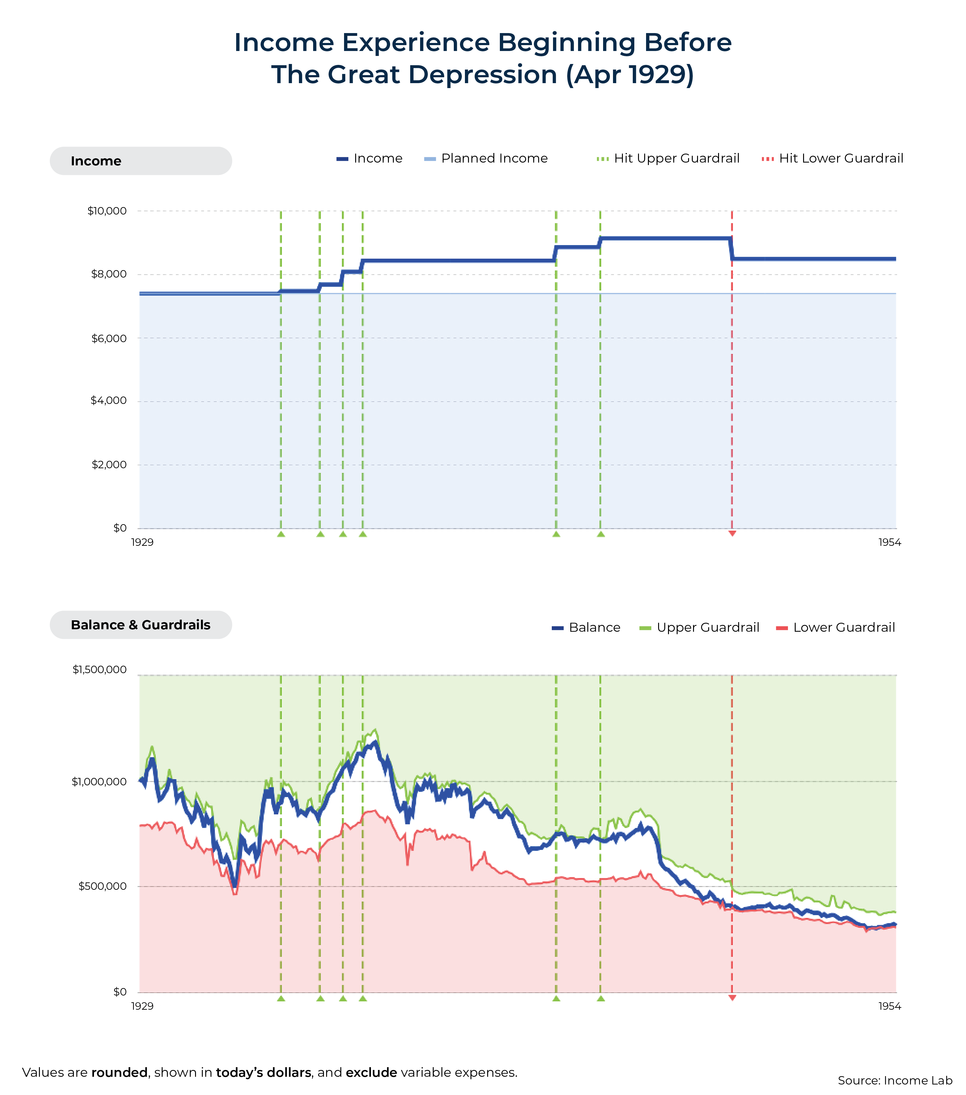 While we plan for scenarios like the Great Depression because it represents a worst-case historical scenario, most retirements experience far more favorable conditions. In more typical market environments, these guardrails would likely trigger more frequent and substantial spending increases, allowing you to enhance your life in meaningful ways – whether that's additional travel, more time with family, increased support for the causes you care about, or whatever brings you fulfillment in retirement.