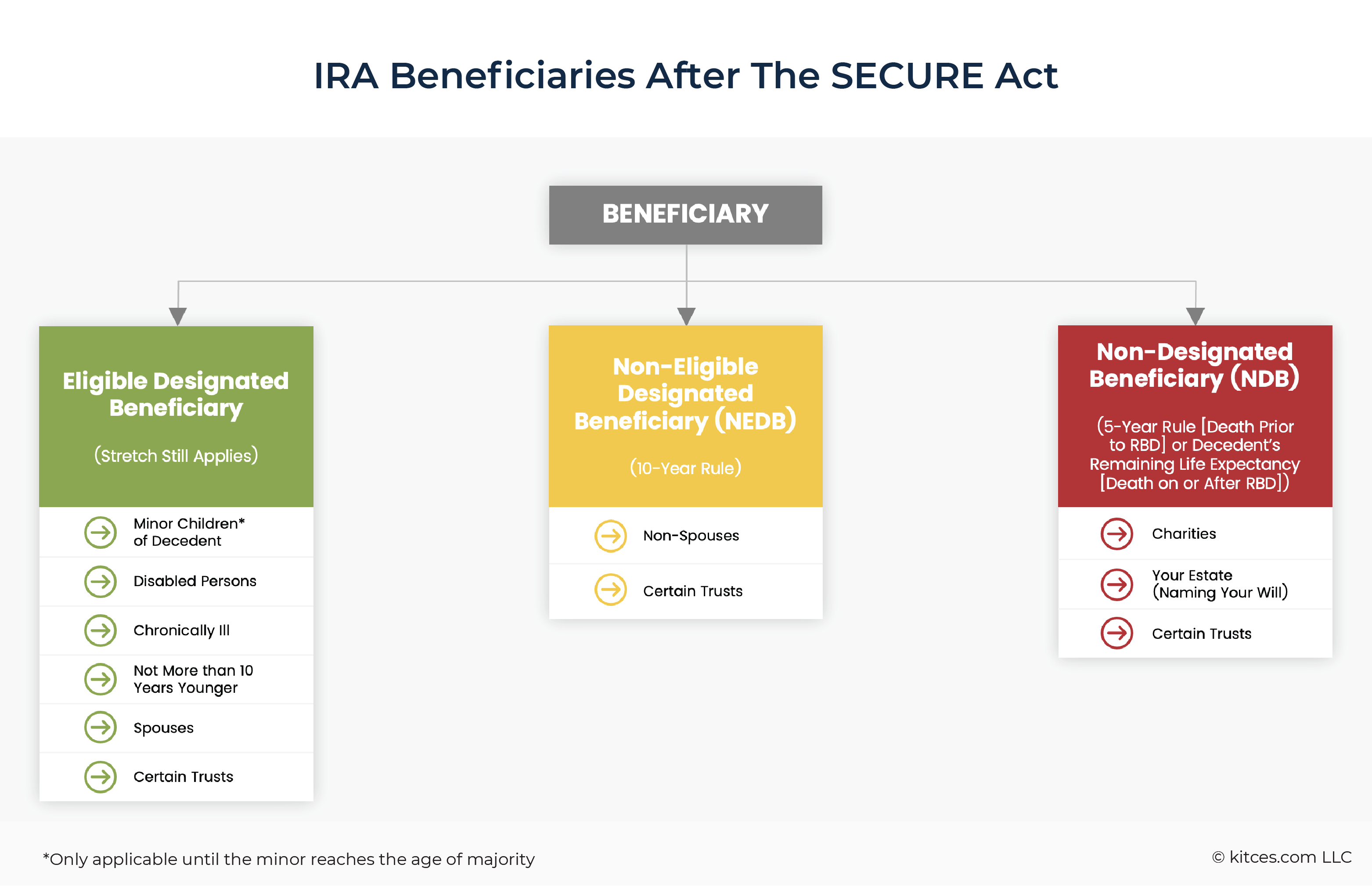 As noted earlier, however, the SECURE Act of 2019 eliminated the stretch for most non-spouse heirs. It did so by dividing designated beneficiaries into two groups: Eligible Designated Beneficiaries (EDBs), who can still use life-expectancy stretch treatment, and Non-Eligible Designated Beneficiaries (NEDBs), who are subject to the 10-Year Rule.