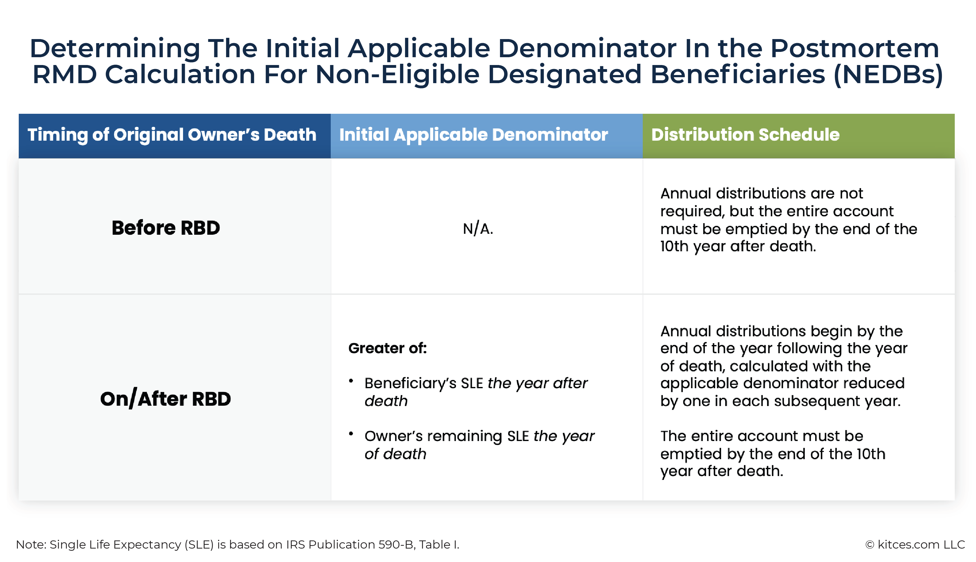 If death occurs on or after the RBD, though, annual RMDs must also be taken based on the SLE factor, in addition to the 10-year deadline. The applicable SLE factor for NEDBs is the greater (longer) of either the beneficiary's remaining SLE – calculated the year after death – or the original account owner's remaining SLE, as of the year of death, minus one.