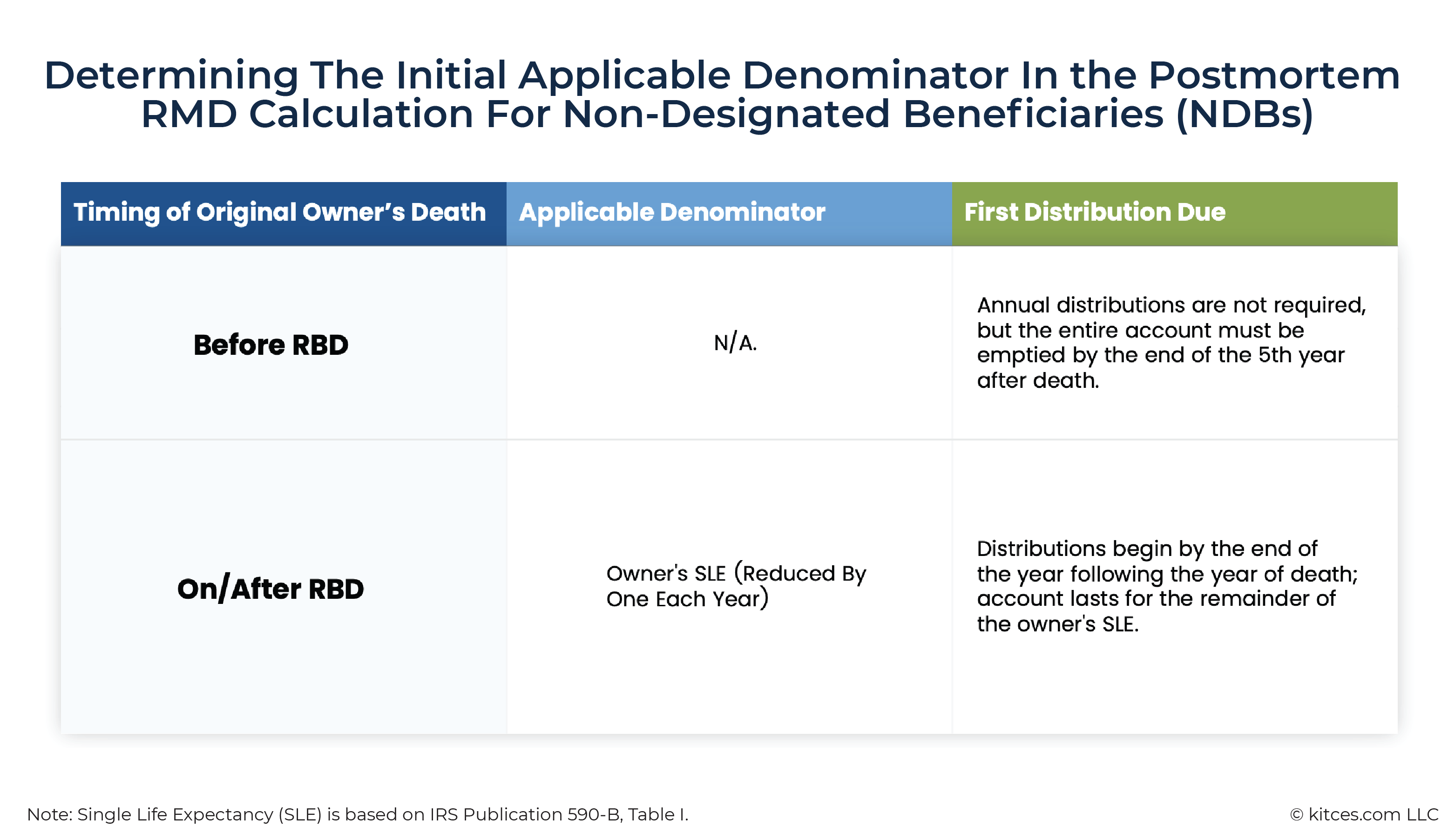 Past the account owner's Required Beginning Date (RBD), this means that unlike a Non-Eligible Designated Beneficiary (NEDB) – who (under current rules) has an inflexible 10-year time limit to empty the inherited account – a Non-Designated Beneficiary (NDB) has a variable amount of time to deplete the account, based on when the original account owner dies.