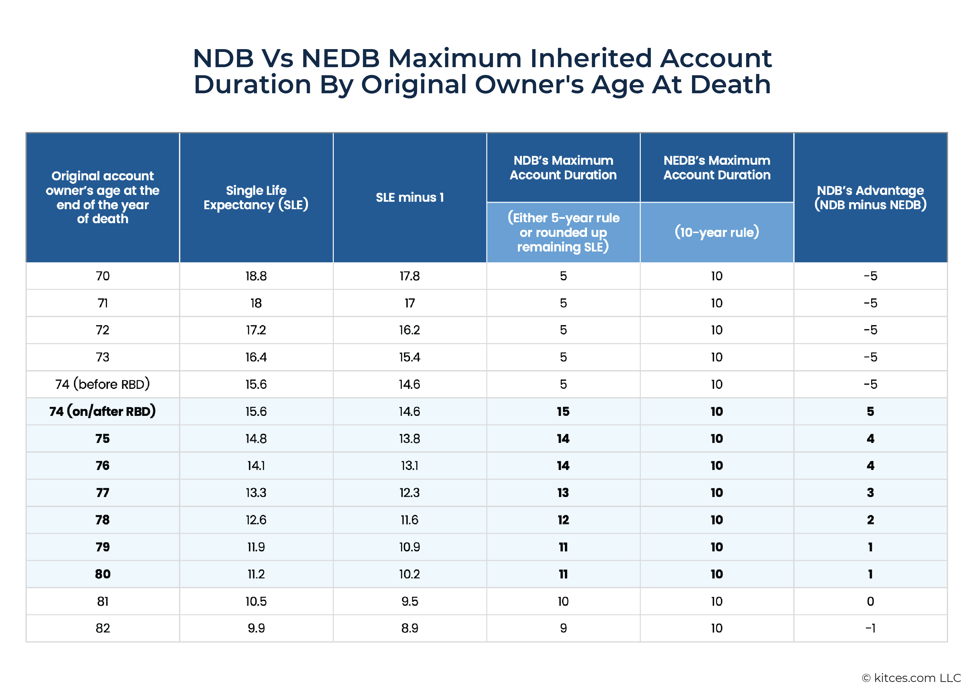 A close inspection of the IRS Single Life Expectancy table reveals that these rules create a brief period following one's RBD when an NDB's inherited account can actually have a longer maximum lifetime than that of an NEDB (i.e., 10 years).