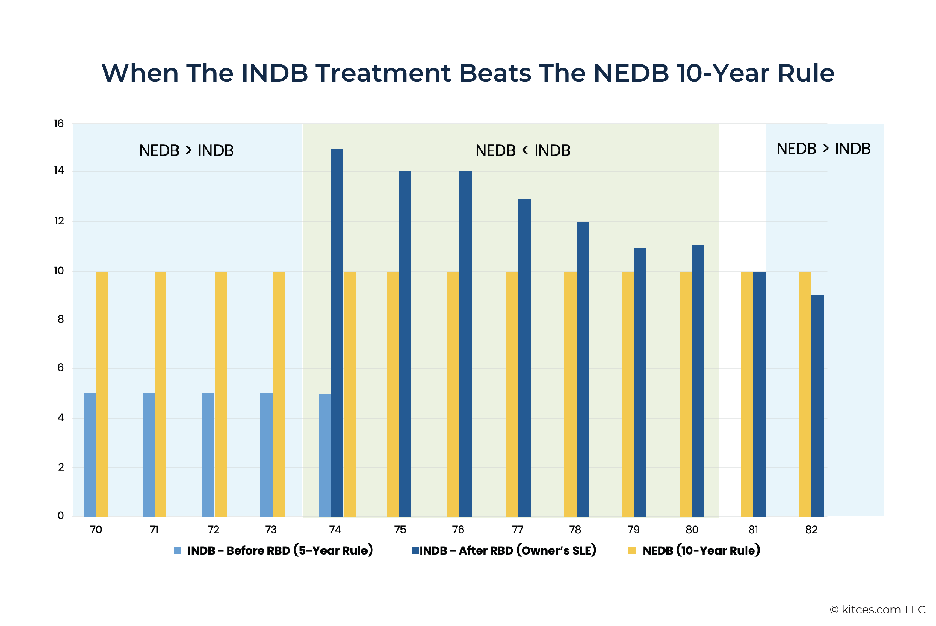 Importantly, once the owner survives past their RBD, the distribution schedules for NDBs is tied to the owner's remaining life expectancy – which, in the early post-RBD years, can exceed the 10-year rule by as much as five years. At that point, deliberately naming specific beneficiary designations, certain types of trusts, or even the owner's estate (all of which can make the heir an 'Intentional' NDB, or INDB) can stretch the payout period well beyond what an NEDB would receive. Still, as the owner ages and their remaining life expectancy shortens, NDB treatment eventually results in a shorter payout period than the 10-Year Rule – making it advantageous to revert back to an individual (i.e., NEDB) designation.