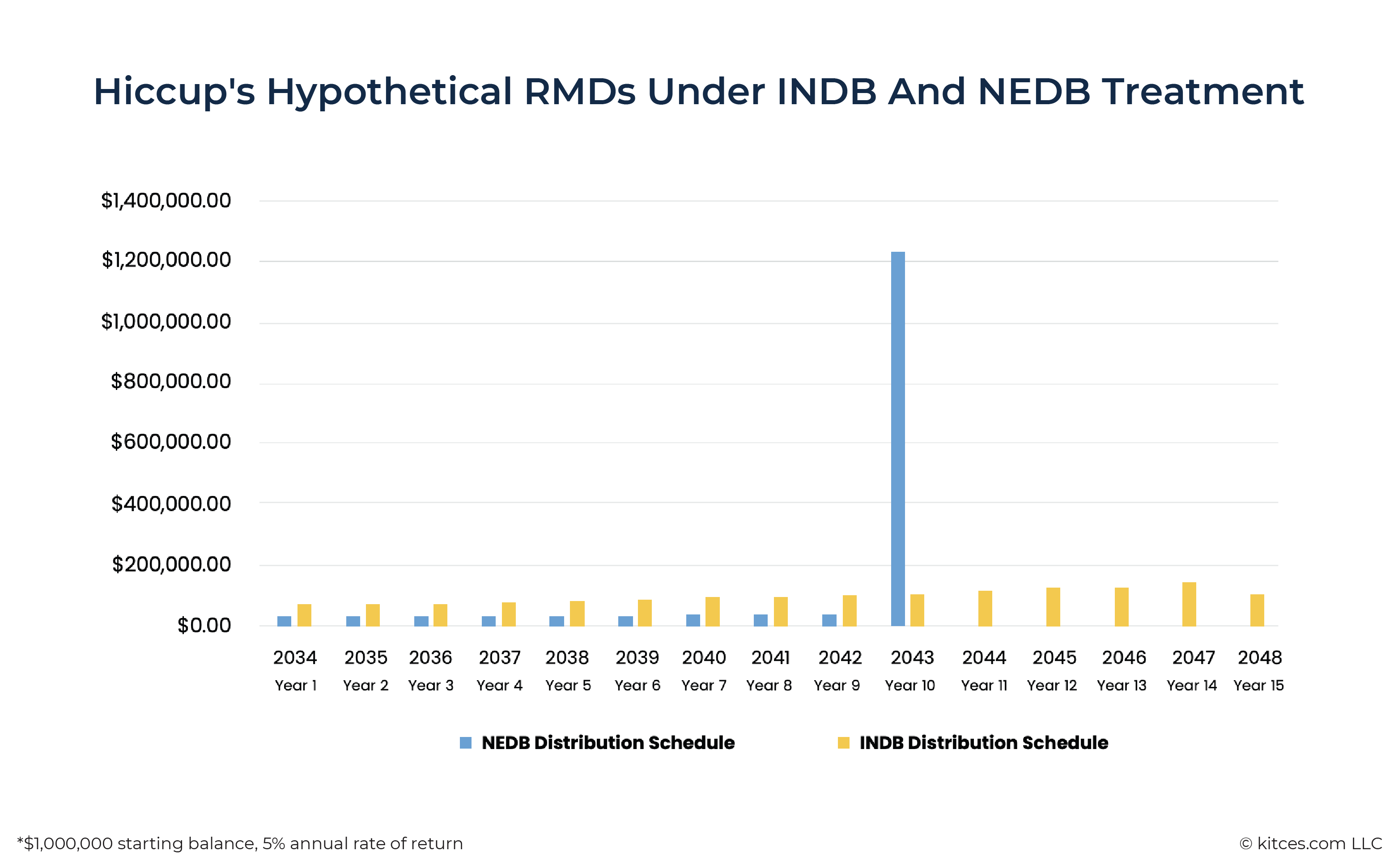 - As an INDB, Hiccup's RMDs are spread over a longer timeline but he has larger RMDs in Years 1-9 – his first-year RMD nearly 2.5X larger than it would be as an NEDB – but, because of these larger distributions, he also has no final-year 'balloon' distribution!