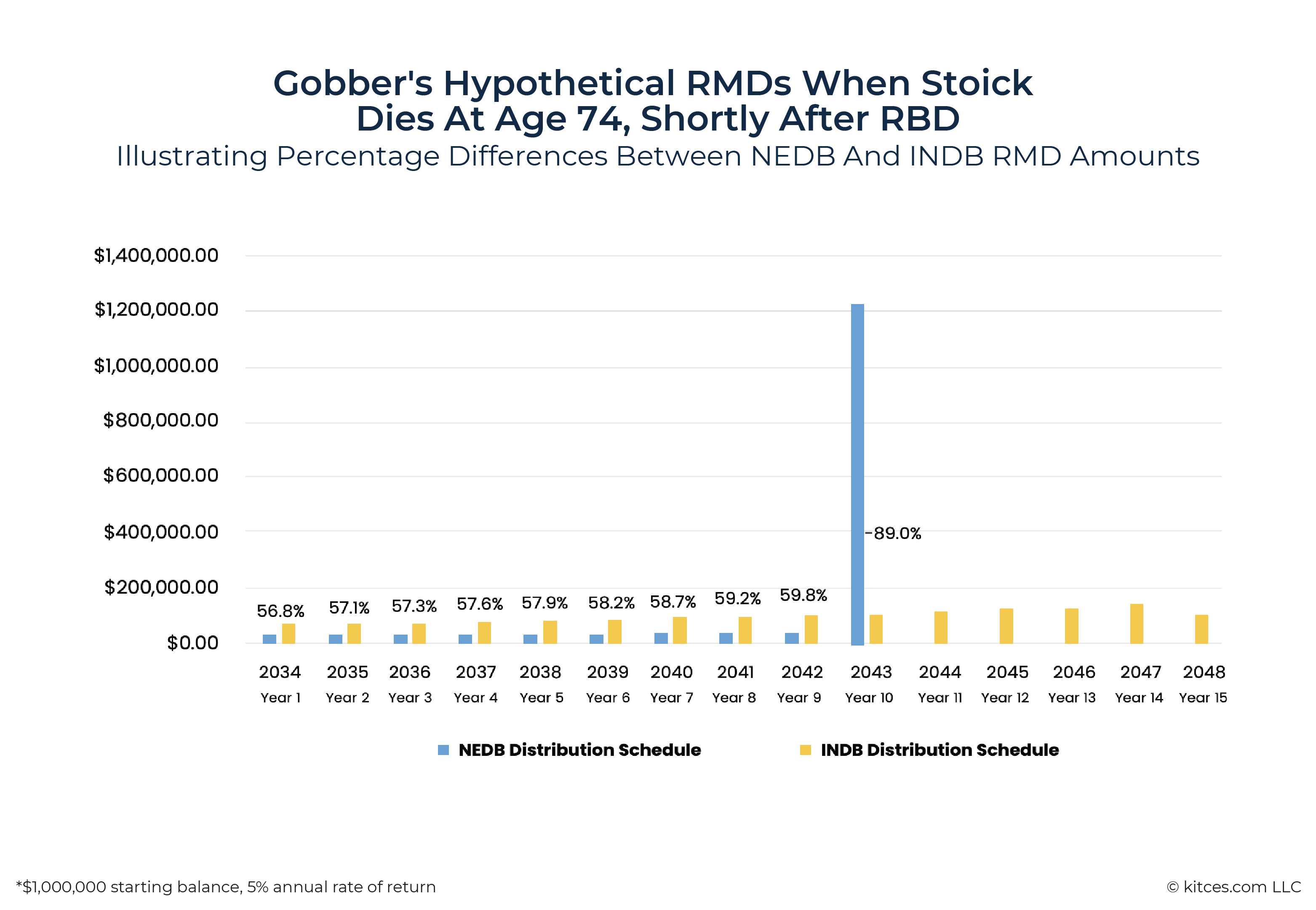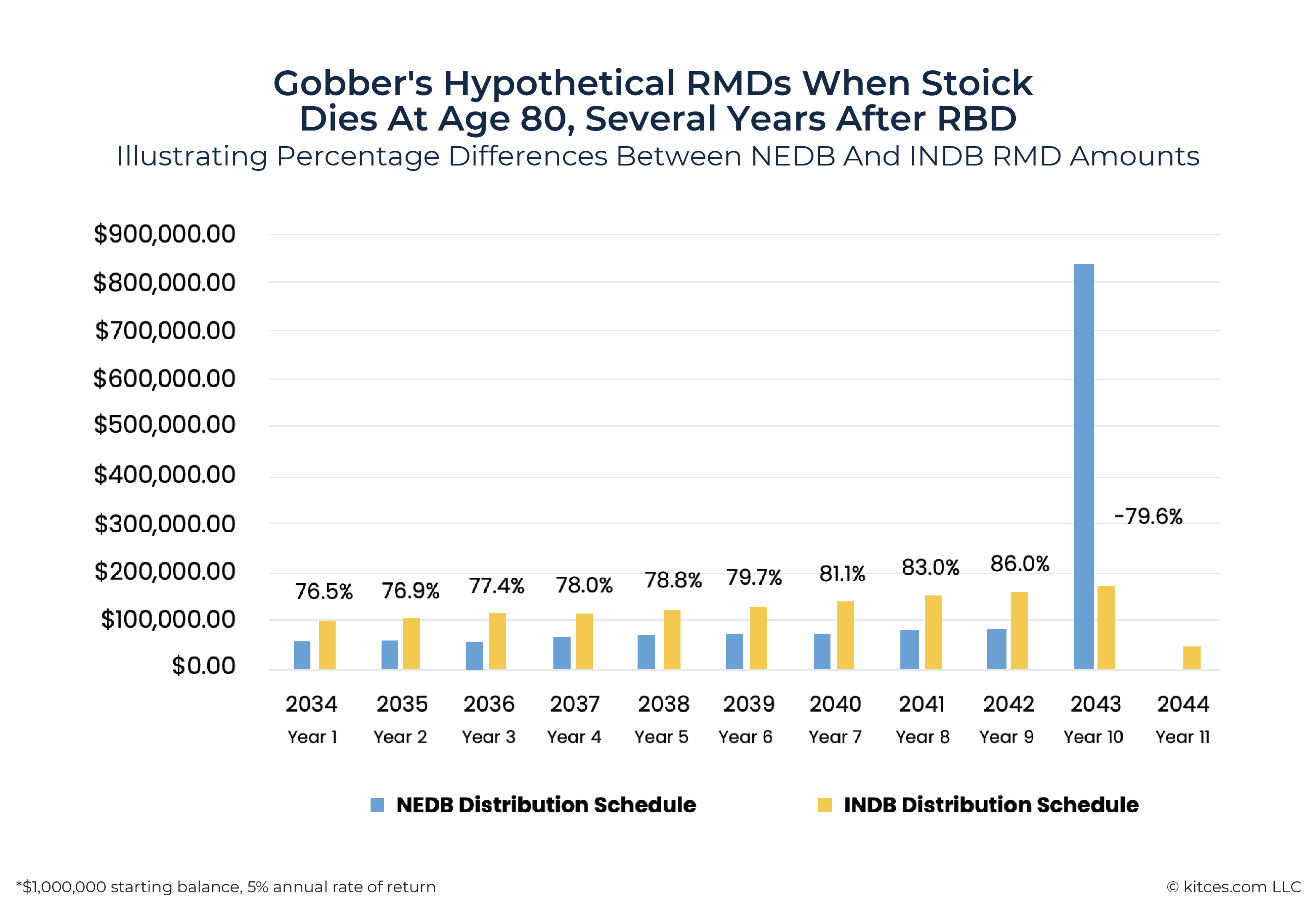 Naming Gobber as an NEDB: If Stoick were to die much later, say on December 31, 2039, and assuming the IRA balance remained the same, Gobber's RMD as an NEDB would be $1,000,000 ÷ 18 = $55,556, or 5.6% of the $1 million account balance.