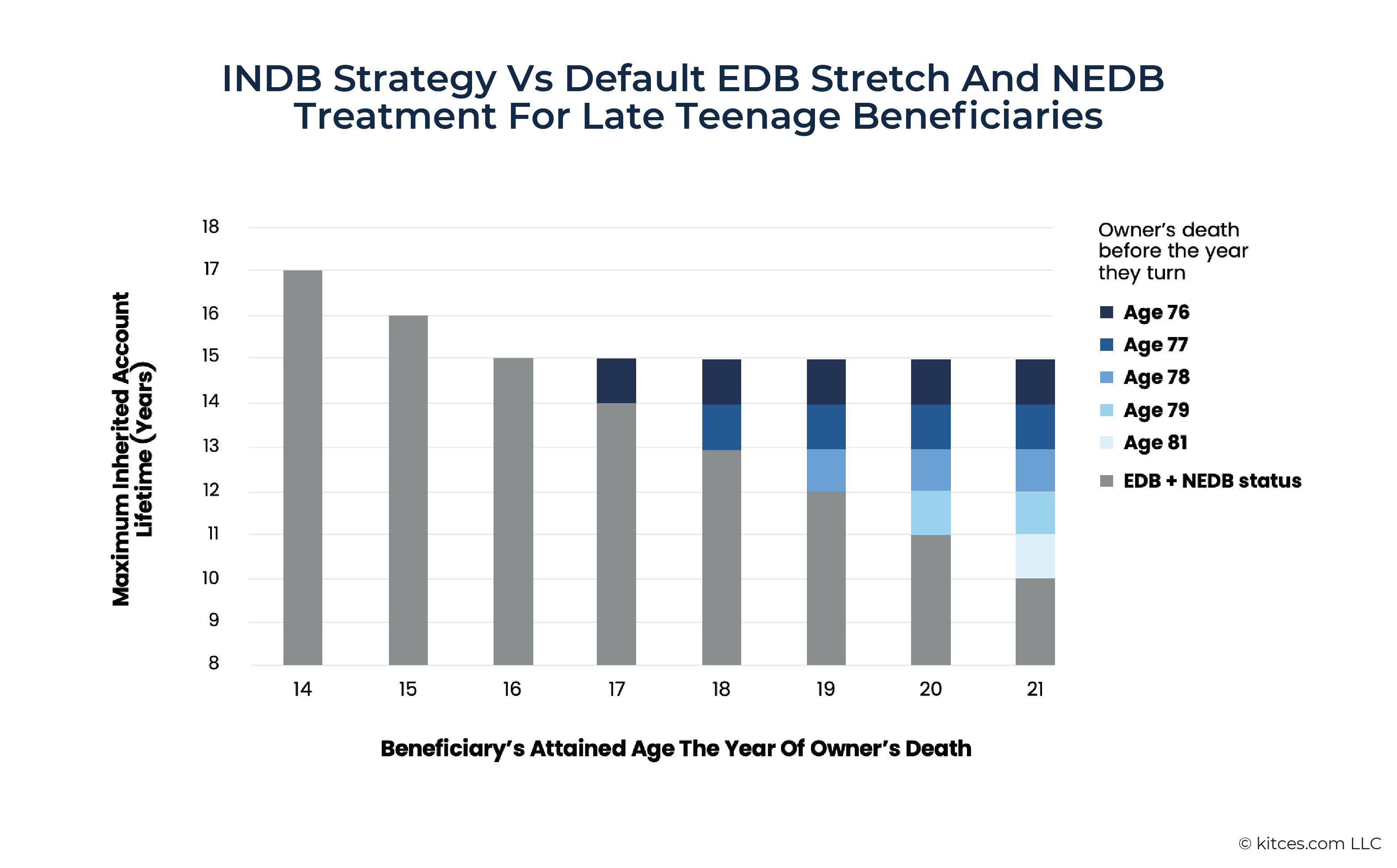 The INDB Strategy's benefit, relative to a minor child's maximum account lifetime as an EDB, depends on both the age of the account owner and the beneficiary in the year of the account owner's death. Prior to the year the owner turns age 76, the INDB strategy yields a maximum account lifetime of 15 years – which is longer than the maximum duration of a 17-year-old's account (14 years, comprised of 4 years of stretch followed by the 10-year rule) and all subsequent beneficiary ages. However, if the account owner were to die at 76, the INDB Strategy would only provide an advantage to beneficiaries 18 and over, for whom EDB treatment yields 13 years or less. These and other critical age combinations are charted below.