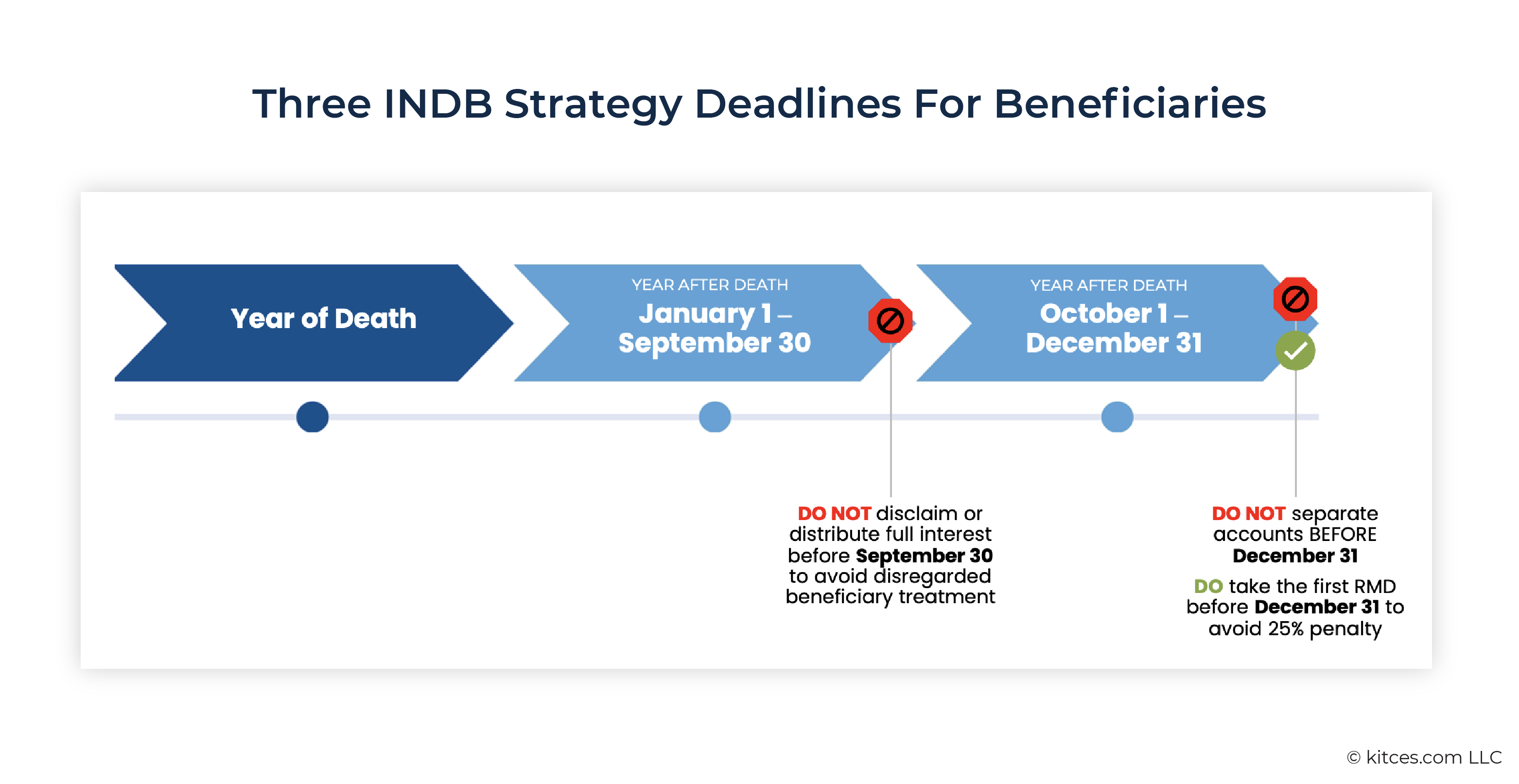When combined, separate account treatment, disregarded beneficiary rules, and the first postmortem RMD deadline can create a trifecta of competing planning deadlines the year following the original account owner's death. In order to benefit from the INDB Strategy, beneficiaries must do the following in the year after the owner's death: