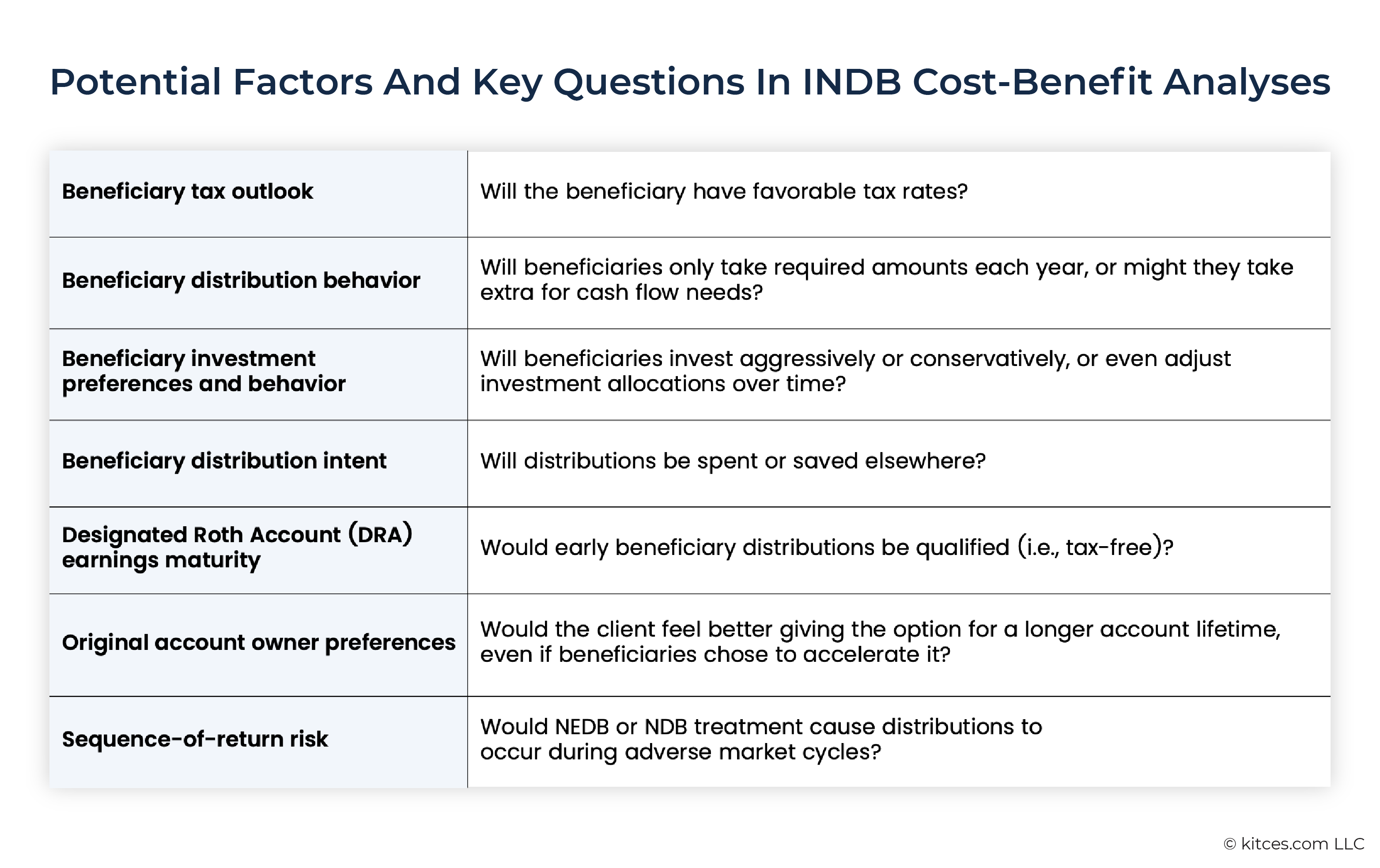 Even under ideal circumstances, though, an INDB's annual RMDs for the first nine years will always be larger than under NEDB rules – front-loading taxable income. Which suggests that a cost-benefit analysis based on each client's unique circumstances (e.g., the intended beneficiaries' tax outlook and distribution behavior, account-specific factors like Roth earnings maturity and sequence-of-returns risk, and the client's own preferences) is essential. Still, for the right clients – such as those with heirs who can absorb higher early traditional account withdrawals, or those with certain Roth employer plans – the benefit of stretching distributions beyond ten years can outweigh the cost.