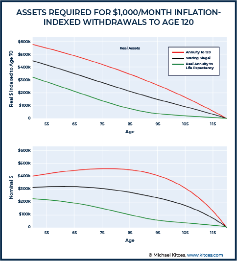 Because this article is focused on the accumulation stage, the rule will be applied in the reverse direction. The chart below plots the assets required to impute an initial withdrawal rate of $1,000 (inflation indexed at 1.78% and age 70) per month using this rule, a maximum age of 120, the 2016 Social Security Period Life Table for a female, and return assumptions of 1.19% real and 2.97% nominal (the real yield of the 30 year TIP and the yield of the 30 year nominal treasury respectively as of the beginning of 2019).