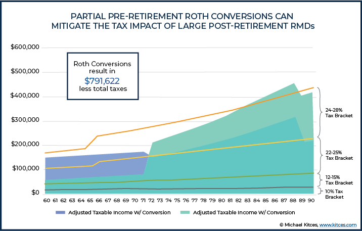 To manage the exposure, Dorothy decides to begin doing partial Roth conversions today of $90,000/year, all of which will be taxed in either her current 22% tax bracket or the 24% tax bracket. By repeating this process every year, Dorothy is able to substantially slow the growth of her pre-tax IRA to be ‘only’ $2.1M by age 72, which will result in an RMD of only $84,000… similar to her ongoing withdrawals during the interim years, and leaving her room to avoid ever being subjected to the 32% tax bracket in the future!