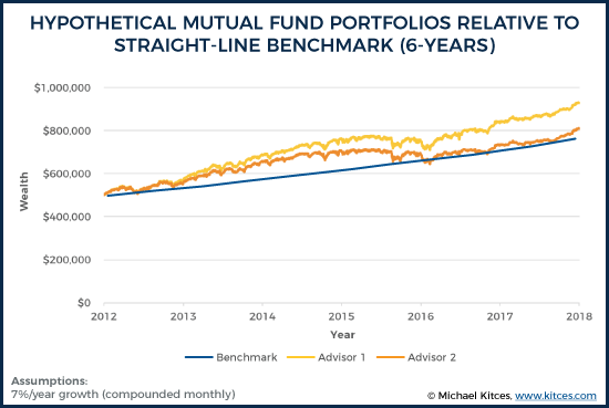 When benchmarked solely to the client’s goals, the good news is that both advisors were able to “outperform” the necessary return benchmark to keep the client on track to their goals (albeit one advisor by a bit more than the other, but both with very favorable results nonetheless).
