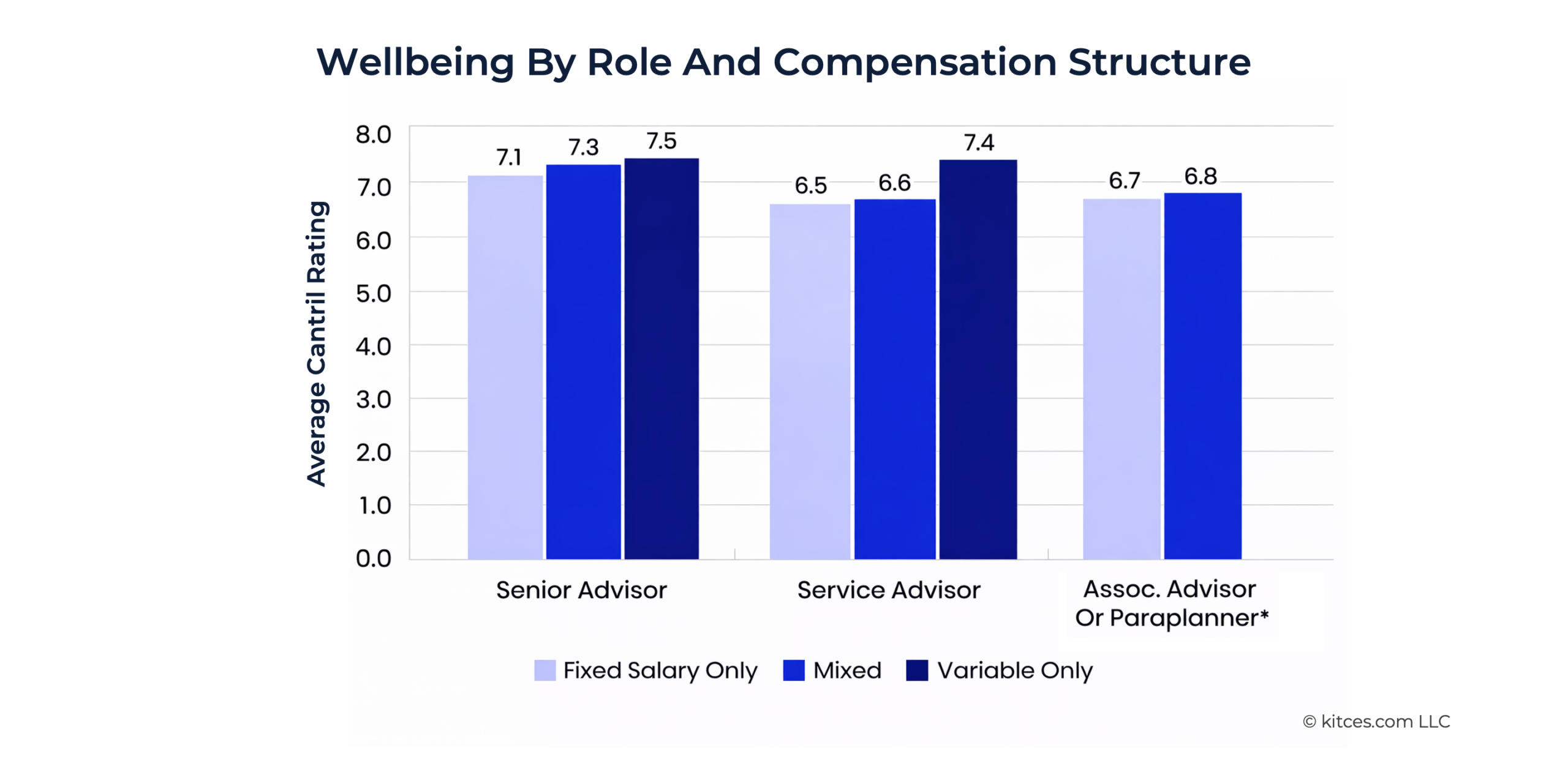 While some of this comes down to higher base pay, this is also an area where variable pay can be especially powerful, especially if the firm wants to incentivize employees to help the firm grow. In fact, Kitces Research on What Actually Contributes To Advisor Wellbeing indicates that variable pay is highly correlated with a team member's overall wellbeing. There is a 6% difference in levels of wellbeing between a fixed salary senior advisor and a variable only senior advisor.