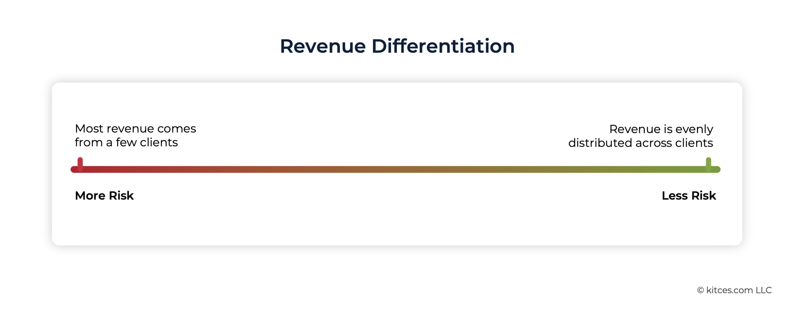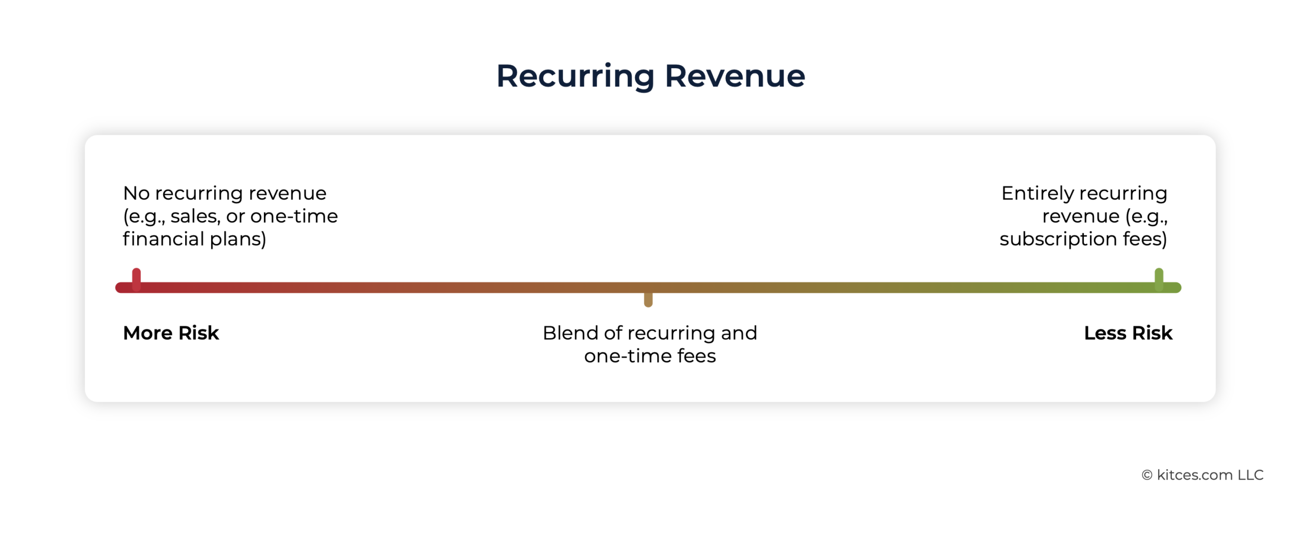 The spectrum of recurring revenue risk is fairly straightforward (especially compared with other dimensions of risk). Simply put: the greater portion of an advisory firm's fees that are recurring, the easier it is to project both revenue and revenue growth consistently. Conversely, one-time fees pose much higher levels of risk in advisory firms. This is especially true for one-time clients who may not re-engage after receiving the advice they need, which means the advisor has to continually prospect just to maintain revenue.