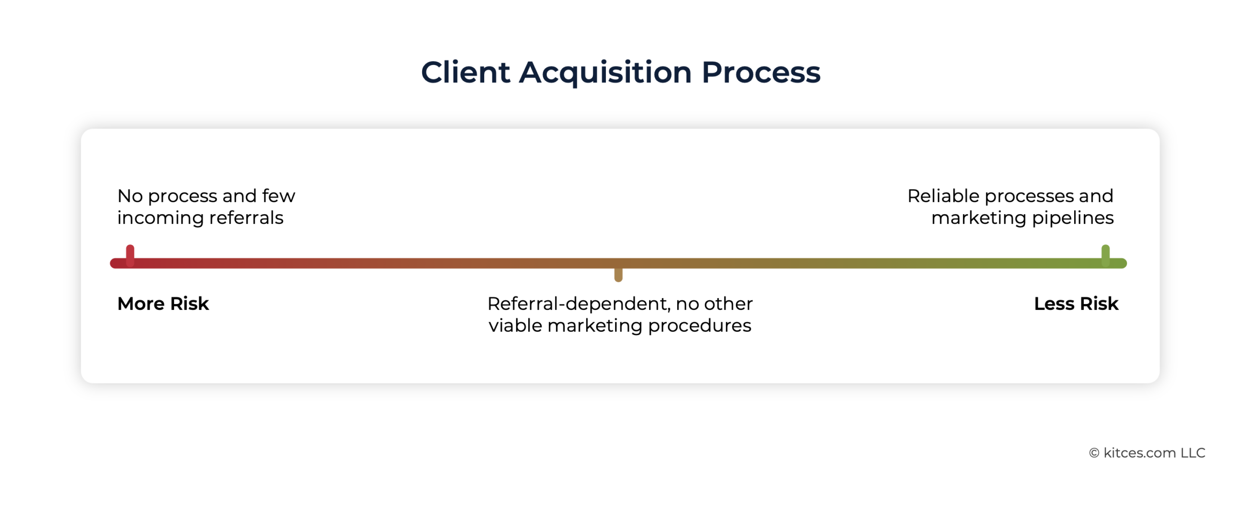 Additionally, client types can pose different types of risk. Firms that depend heavily on a few large clients or underprice certain client segments create fragility in their revenue base. Much like concentrated portfolios, these risks require proactive diversification – either by gradually adjusting fees, 'graduating' misaligned clients, or growing segments with similar profiles. And in the realm of client acquisition, many solo or small firm advisors rely heavily on their own time and energy for marketing, creating a bottleneck as the firm scales. As the firm grows, this advisor-centric approach becomes unsustainable. Shifting to scalable marketing channels, outsourcing, or delegating to team members reduces dependency on the lead advisor and lowers long-term acquisition costs.