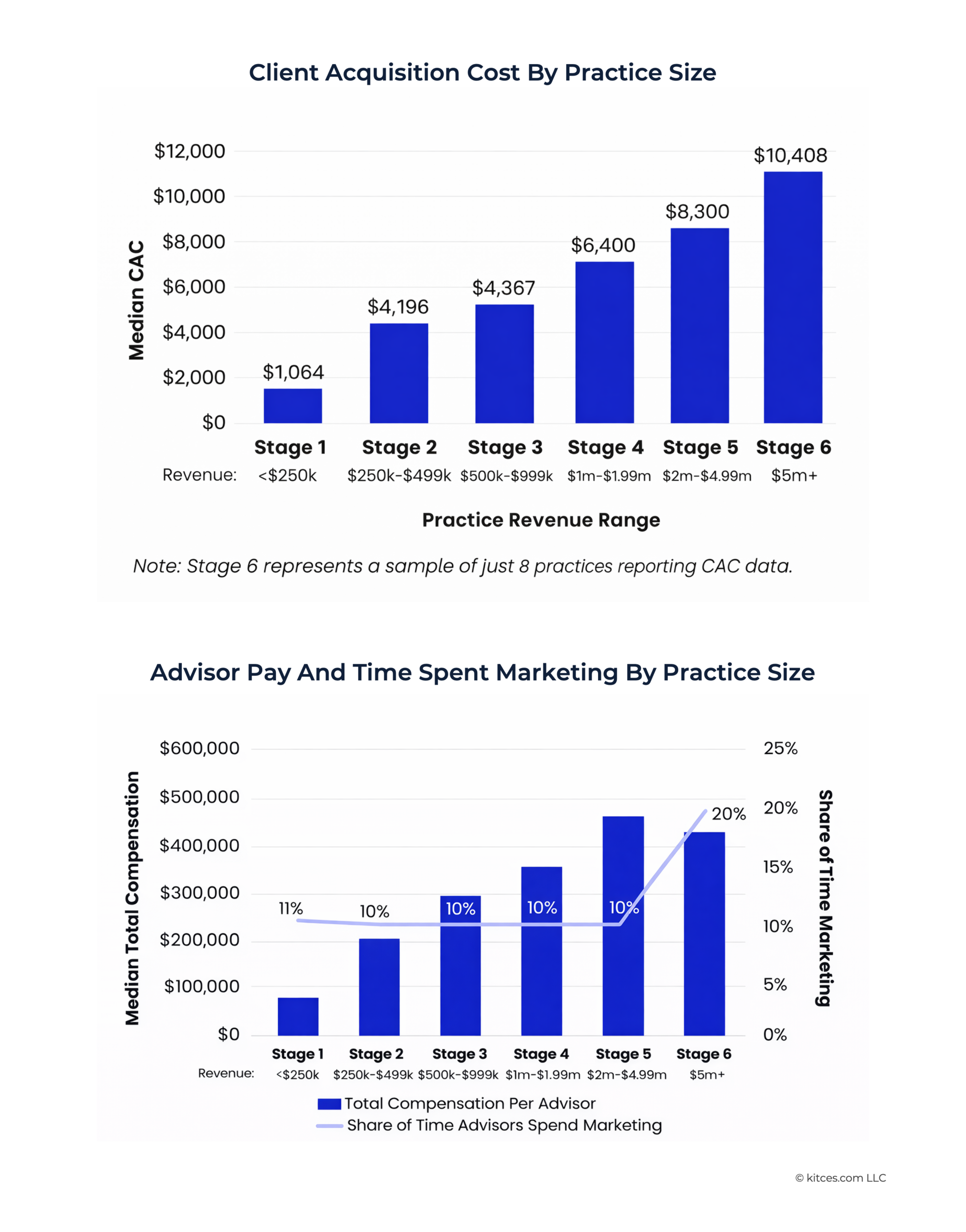 When starting their advisory firm, the lead advisor is essentially responsible for every role (at a new firm, there aren't really other options!). Even after the firm is established and the team starts to grow, it is very common for lead advisors to continue to do the prospecting in the client acquisition process. However, when the marketing begins to work, and an advisory firm and team grow, it can pose a significant risk for the firm if most or all of the machinations of marketing rely on the lead advisor's continued time and attention. Kitces Research on How Financial Advisors Actually Market Their Services finds that as firms grow, advisors spend more time marketing. To some degree, this is logical, especially as many advisors opt for time-based marketing tactics such as marketing events. These tactics are effective, particularly in the early days of the firm before an advisory firm starts to grow. However, once the firm starts to grow, the advisor's compensation typically increases as well. So, even if the amount of time that an advisor spends on marketing stays the same, these tactics become more 'expensive' in parallel with the advisor's time. Which then culminates in a higher client acquisition cost! These dynamics are illustrated below: when an advisor's core marketing strategy relies on their time, client acquisition cost will inevitably grow with the practice revenue.