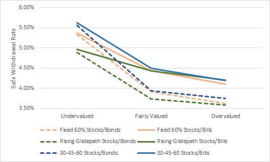 Accordingly, the chart below shows the safe withdrawal rate that would have worked depending on whether markets were overvalued, fairly valued, or undervalued at the start of retirement, segmented by whether the portfolio uses a combination of stocks and bonds (dotted lines), versus using stocks and Treasury Bills instead (solid lines), and whether the equity exposure is based on a fixed 60% allocation (yellow lines) or a portfolio that adopts a(n accelerated) rising equity glidepath starting at 30% in equities and increasing by 2%/year for 15 years (leveling off at the same 60% equity exposure for the second half of retirement) (green lines). (Michael’s Note: In the results based on historical data, a full 30-year rising equity glidepath was not an improvement over a static portfolio, suggesting that historically mean reversion has been powerful enough that waiting all 30 years to execute the glidepath is just “too slow”; by contrast, 15-year rising equity glidepaths that align better to typical long-term mean reversion appeared to yield far more favorable outcomes.)